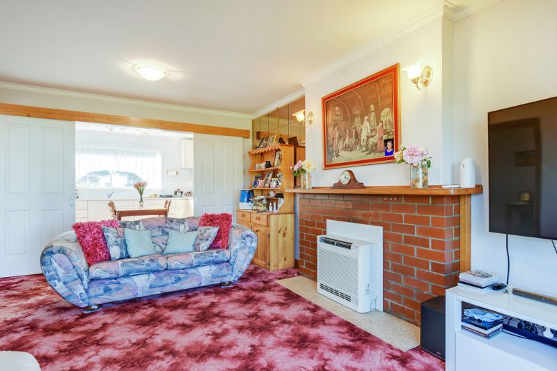 The living room with reverse cycle inverter benefits from large corner windows overlooking the front garden and double cavity sliding doors through to the sunny eat-in kitchen with lots of bench space and storage including corner pantry, modern appliances and direct access to the laundry and back yard.