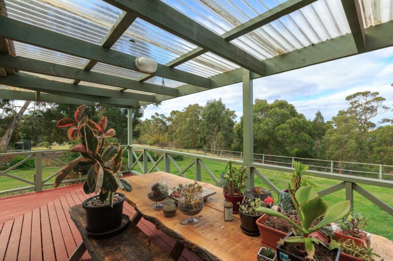 The large rear garden is fully fenced providing a safe, spacious area for pets yet keeps wildlife away from the house and shrubs. Electric fencing, a horse shelter and feed storage shed make this a horse friendly property. A generous 3 bay Colorbond garage provides ample parking for cars plus work shop space