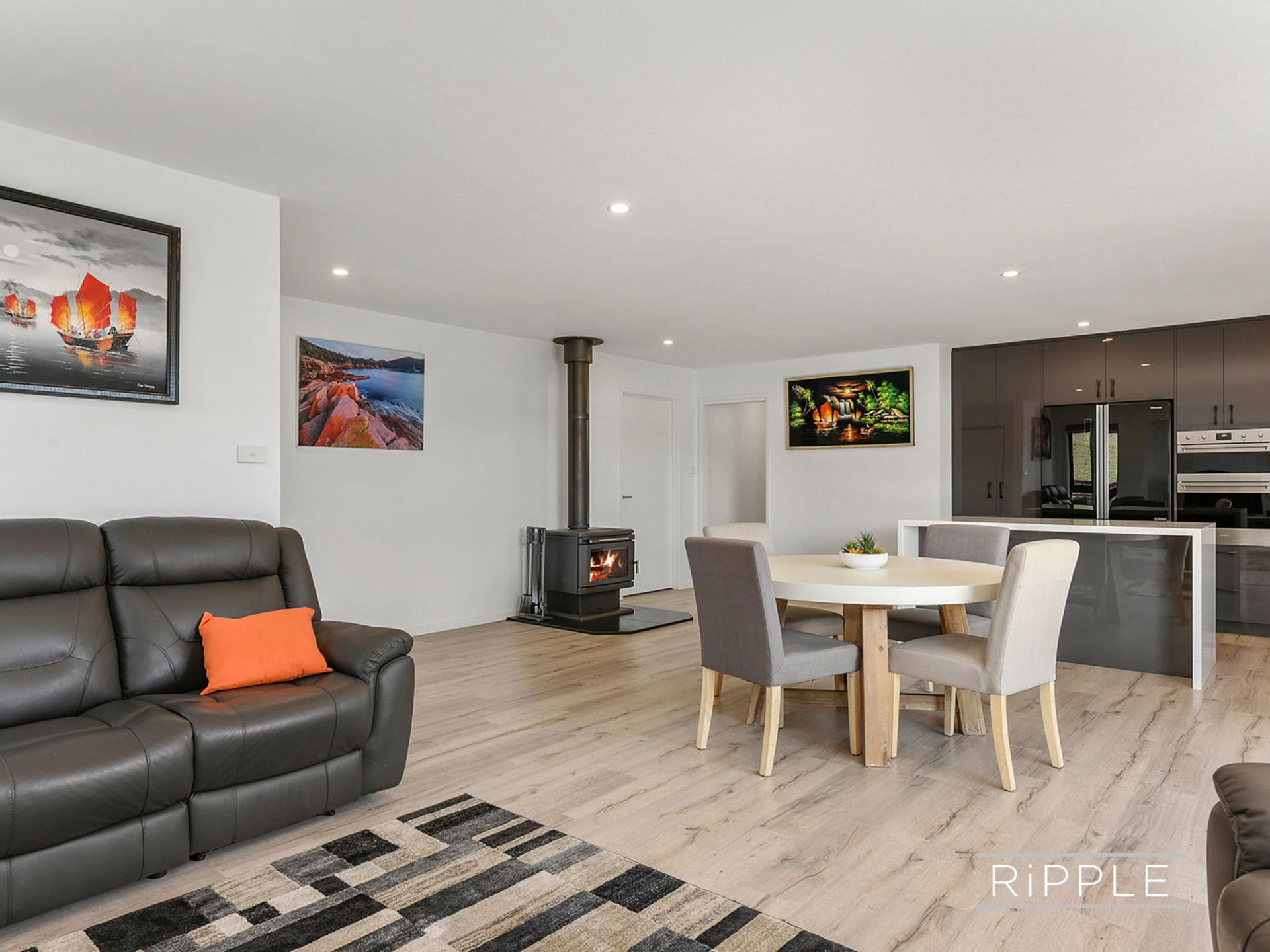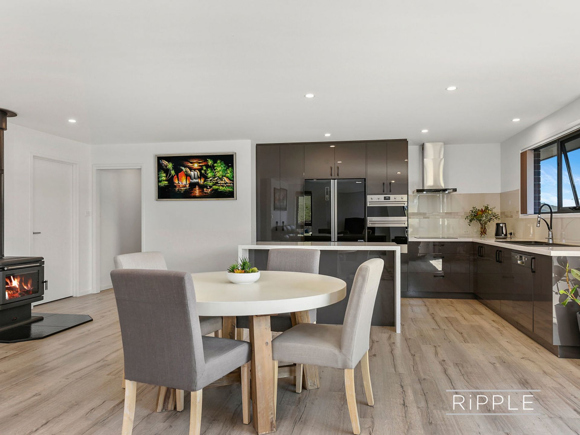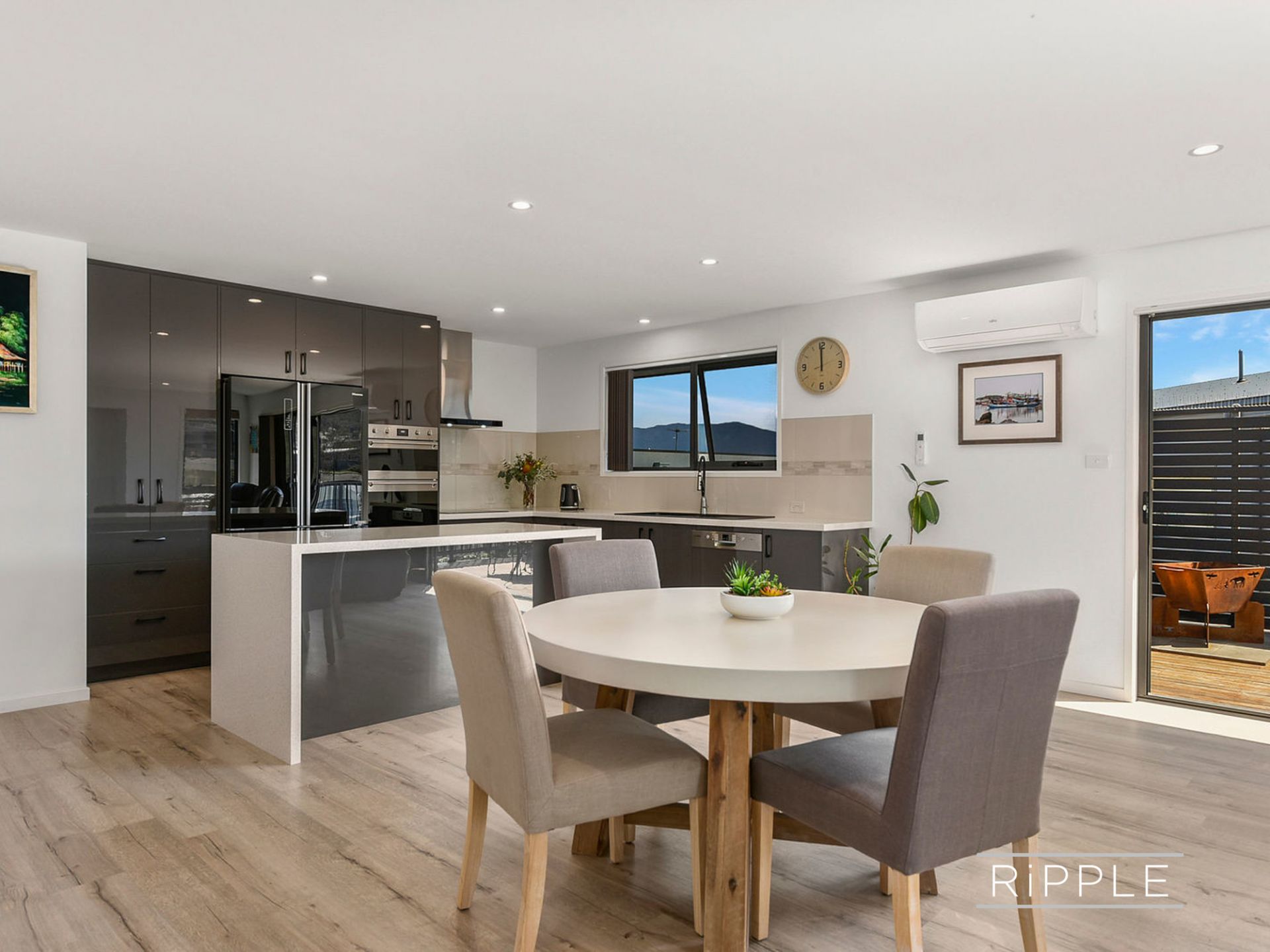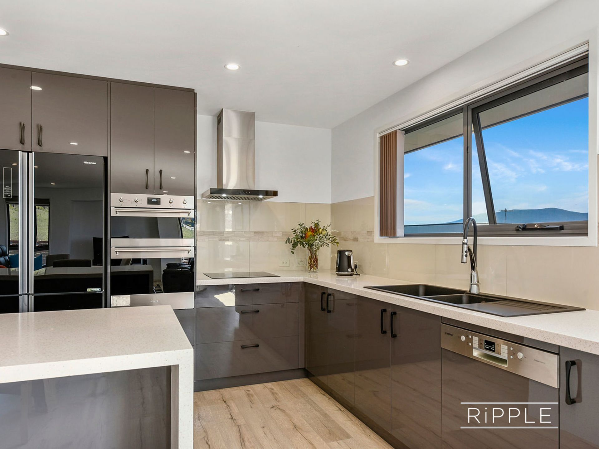 Generous open plan living comprising lounge, dining and kitchen forms the heart of the home. Quality European appliances, an integrated dishwasher, double oven, soft close joinery and resin bench tops with waterfall edges make cooking and entertaining a joy. Sliding doors open onto the private and sunny north facing deck to create seamless indoor/outdoor living and a quiet space to admire tranquil water views.