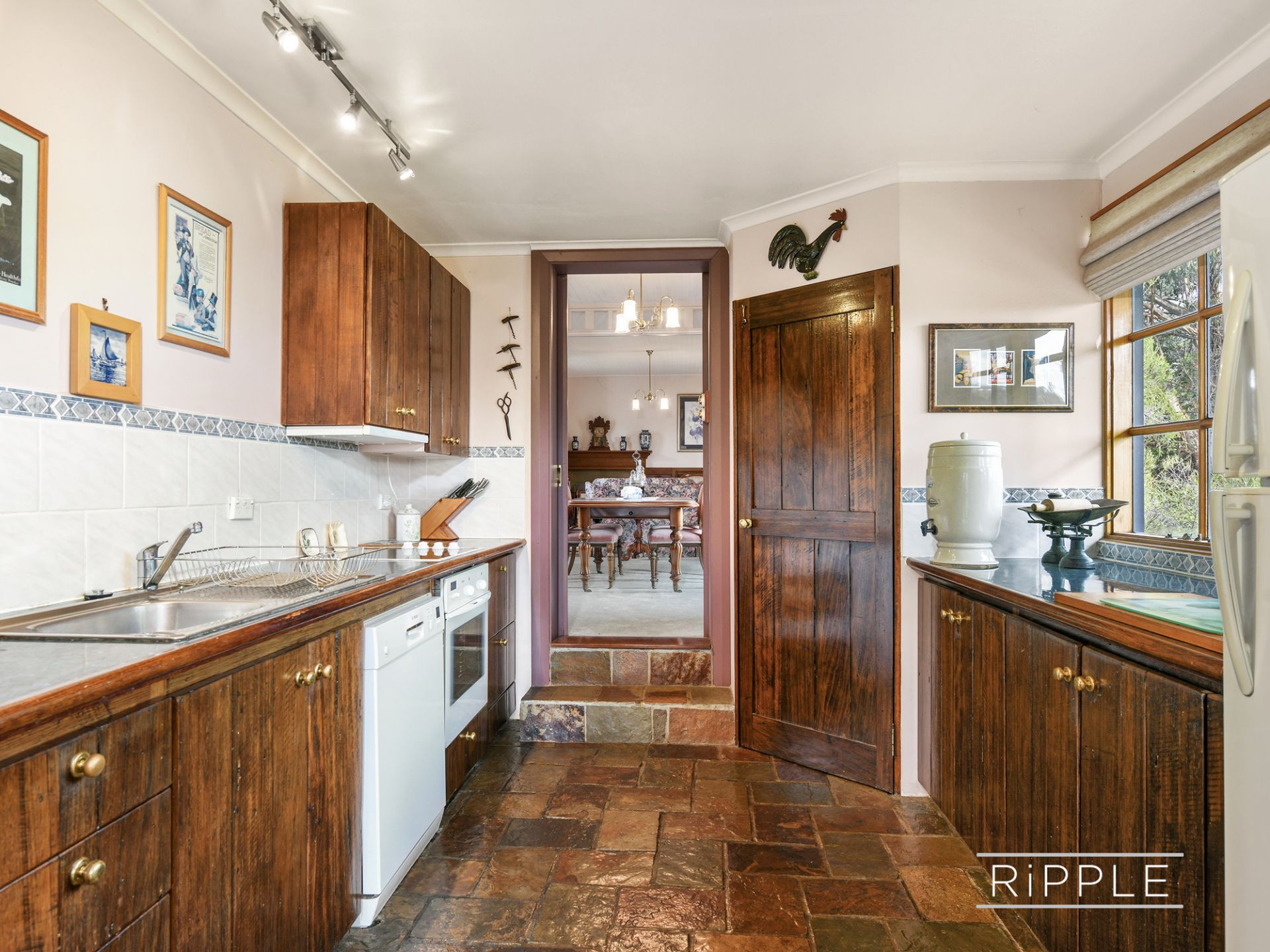 The expansive living area is made up of an elegant formal lounge and dining room, rumoured to have once been a bakery - now ideal for hosting guests. The functional kitchen is generously proportioned with an easy flow between the living zones, the sunny family dining space has a wood fire for winter warmth and double glass doors leading directly outdoors, and a second lounge provides a relaxed and versatile communal space.