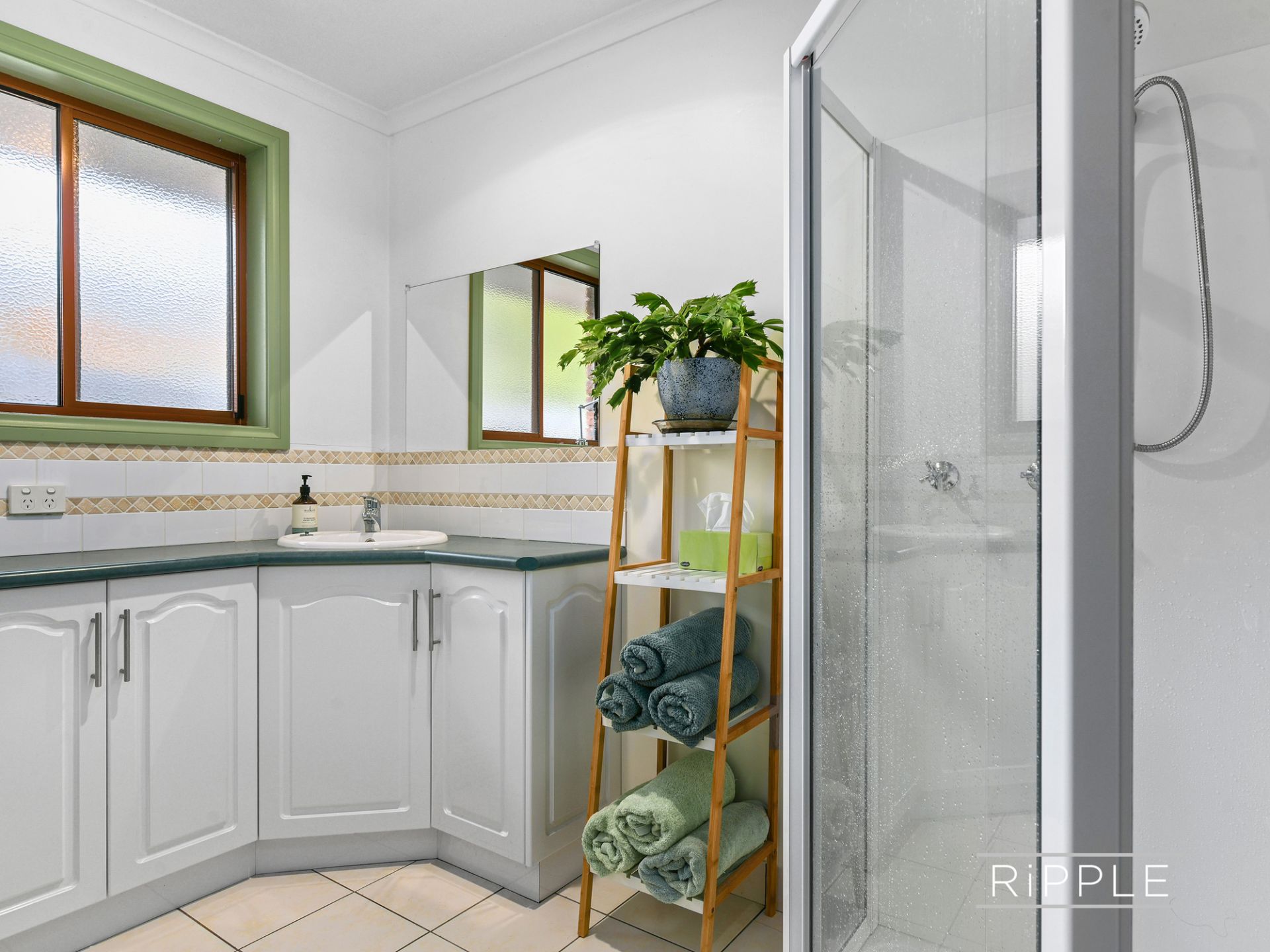 The main bathroom includes a corner shower, wide vanity, a separate toilet, with laundry facilities adjacent; and the handy second bathroom has a shower, vanity, and toilet.