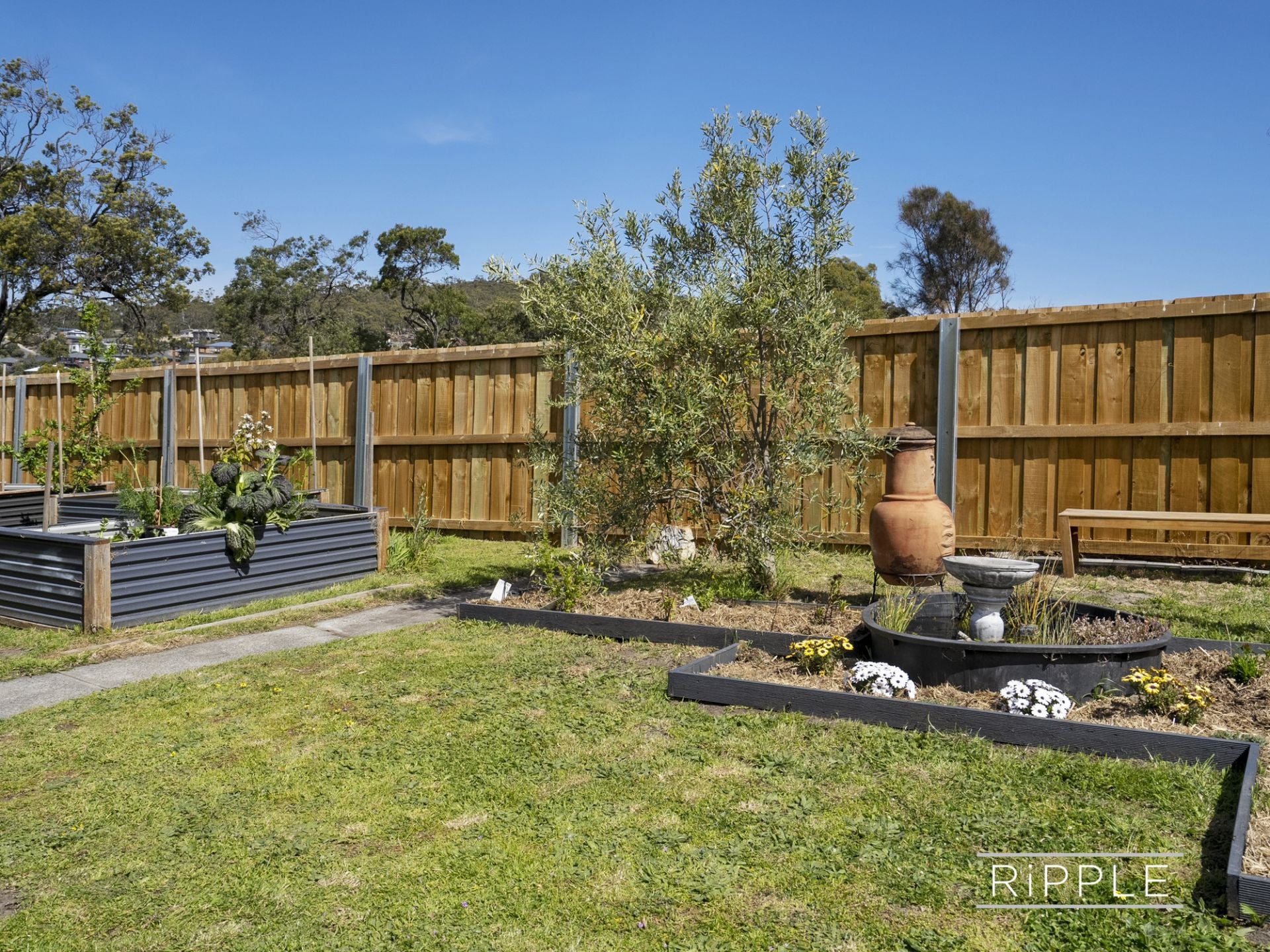 The backyard also offers a 3 x 3m garden shed, under house storage, multiple raised garden beds, sheltered deck areas and a bird-attracting pond.