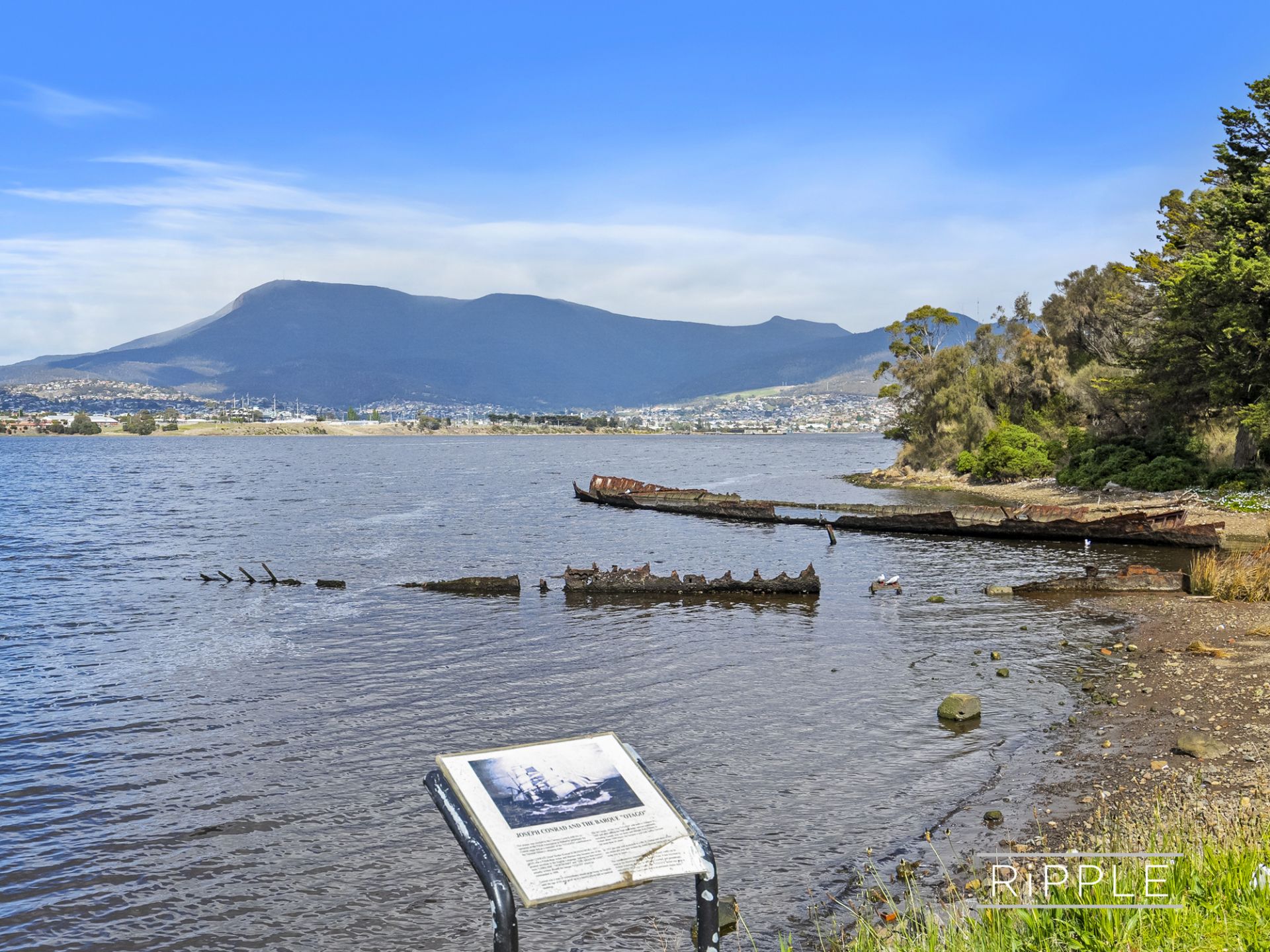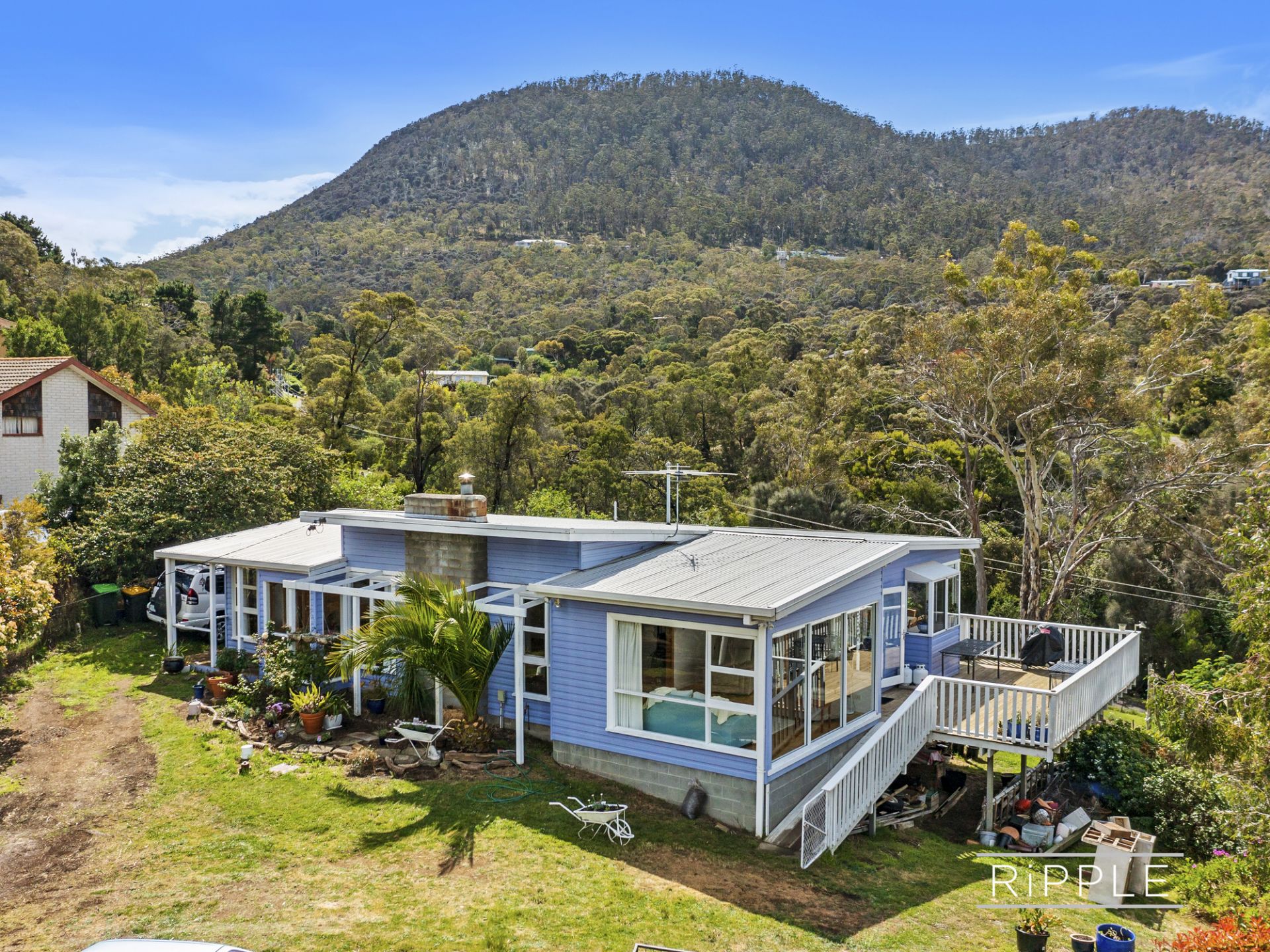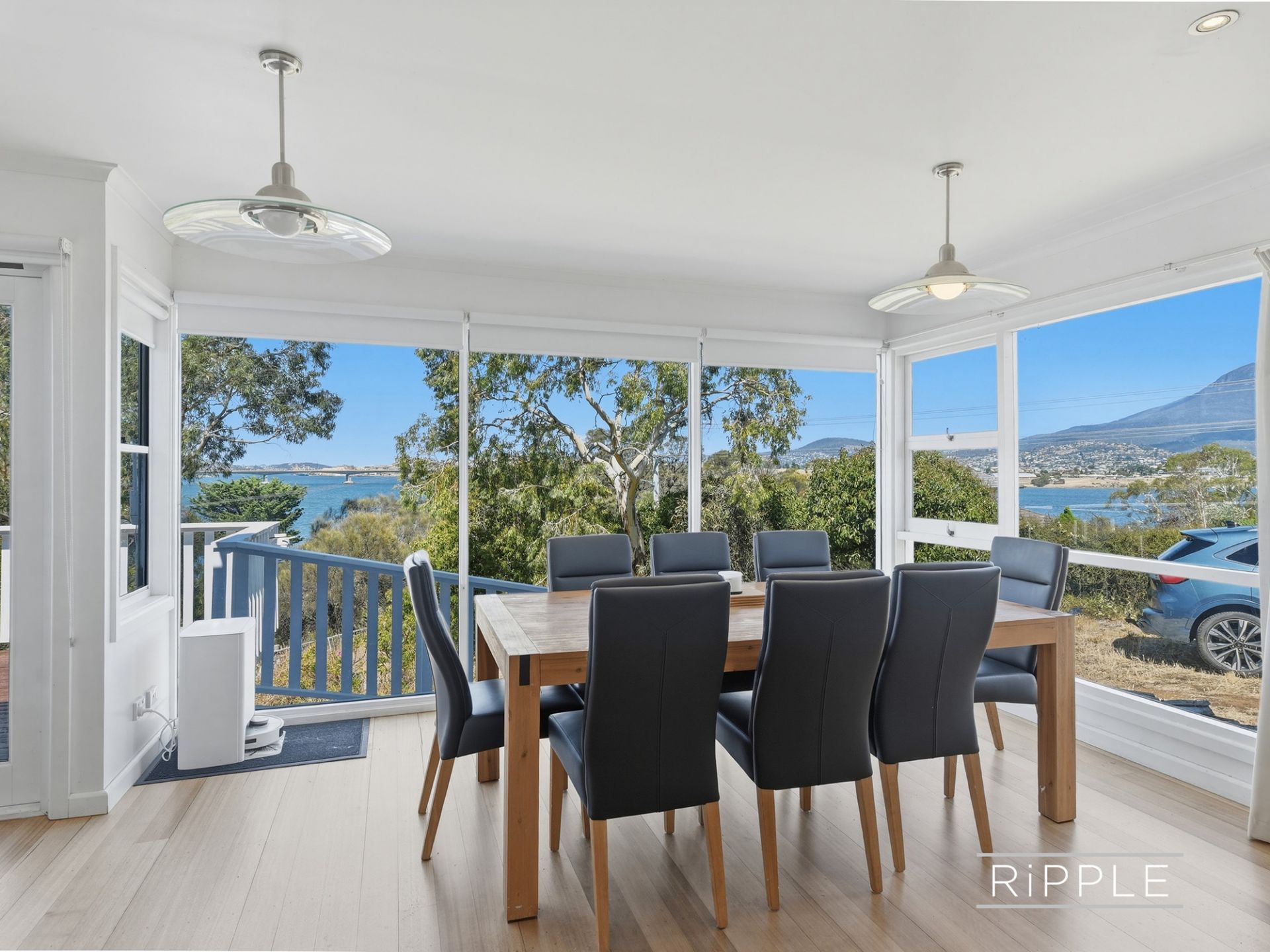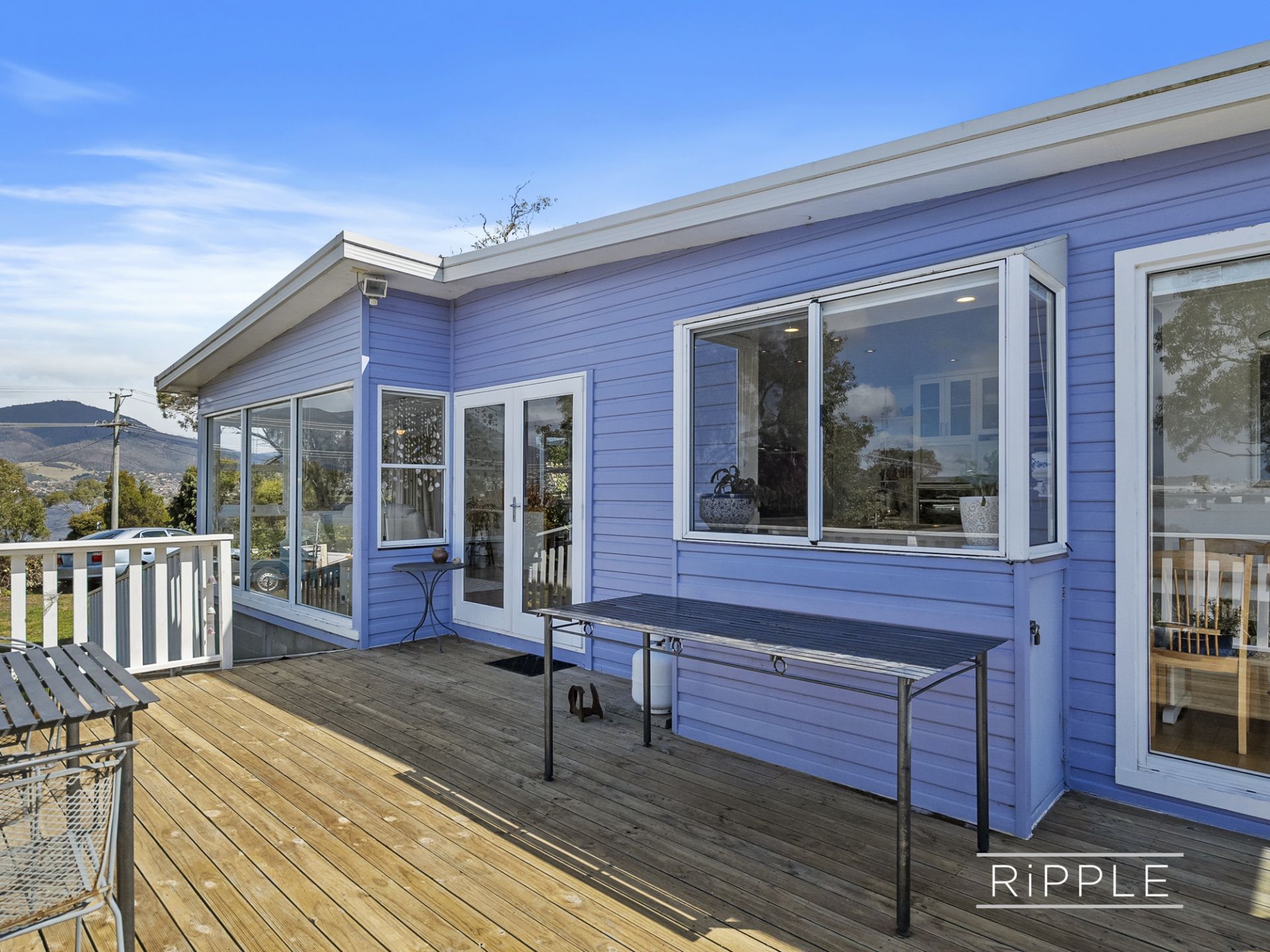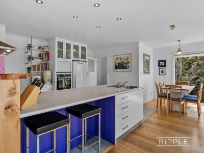 Nestled amongst the trees, the unique mid-1960s weatherboard home is warm, welcoming and full of character. Bathed in all-day sun, the open plan living zone captures breathtaking views across the Derwent River, over Bowen Bridge, and beyond to kunanyi / Mount Wellington and Mount Direction.